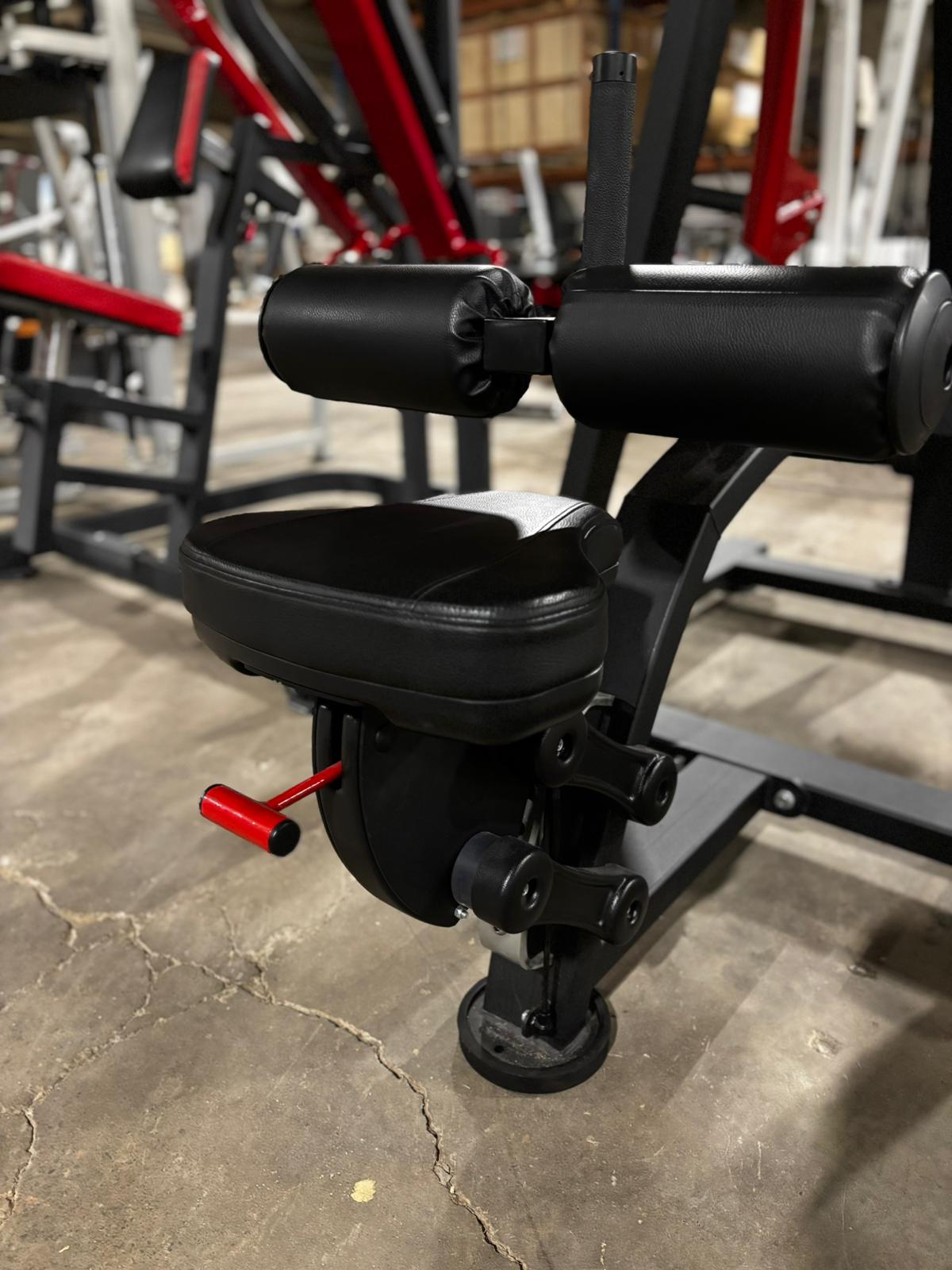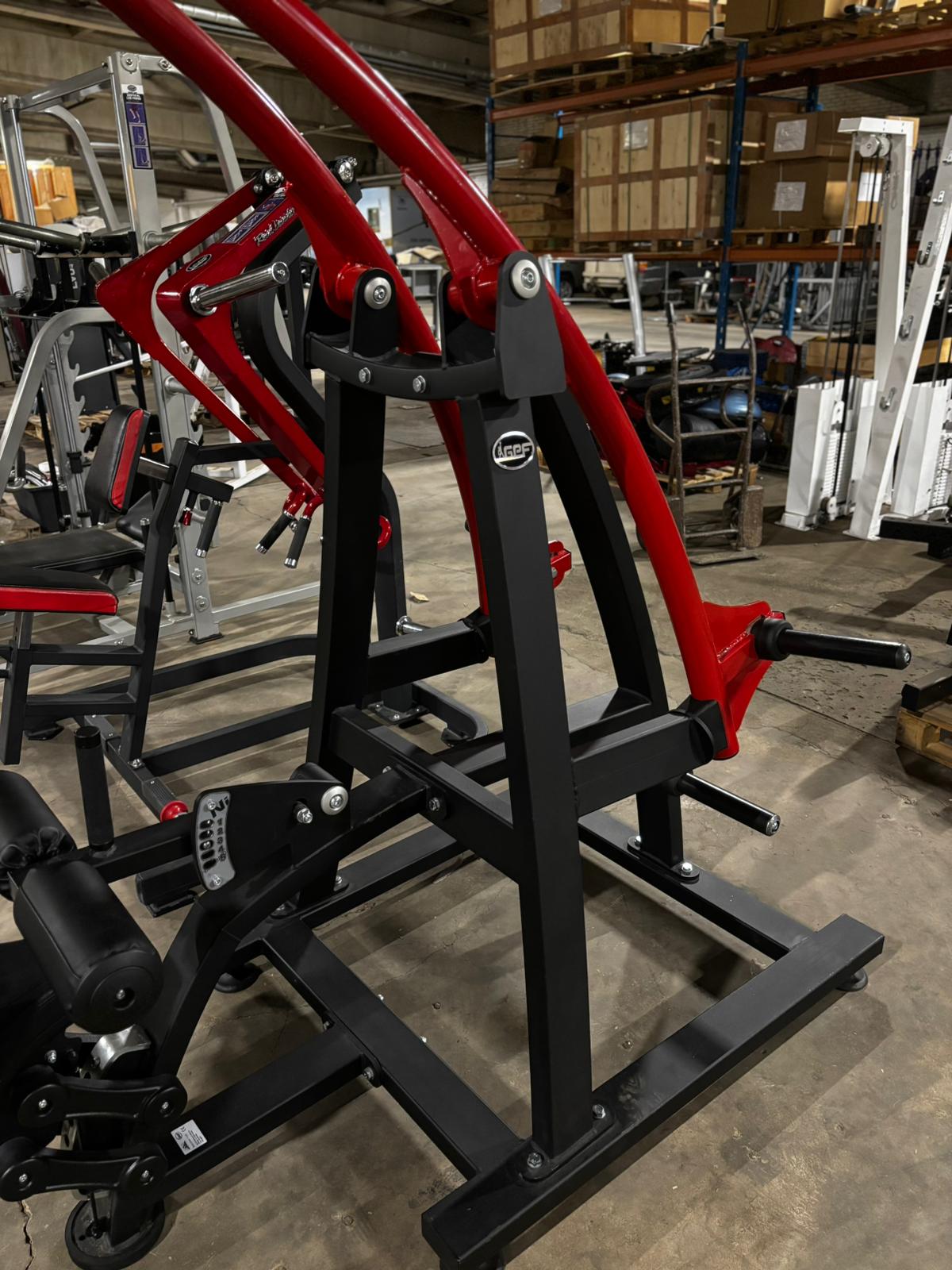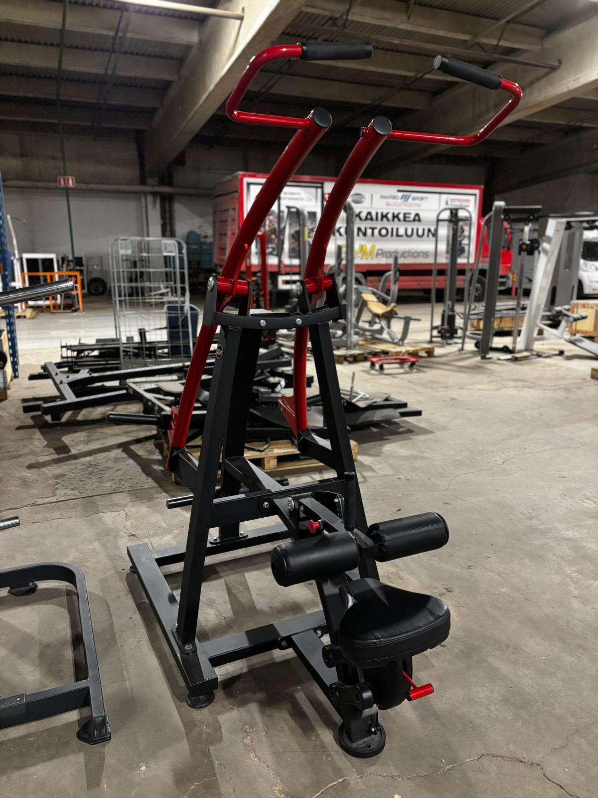 Käytetty Marbo Sport levypainokuormitteinen alasvetolaite. Laitteessa säädettävä istuin ja polvituki.