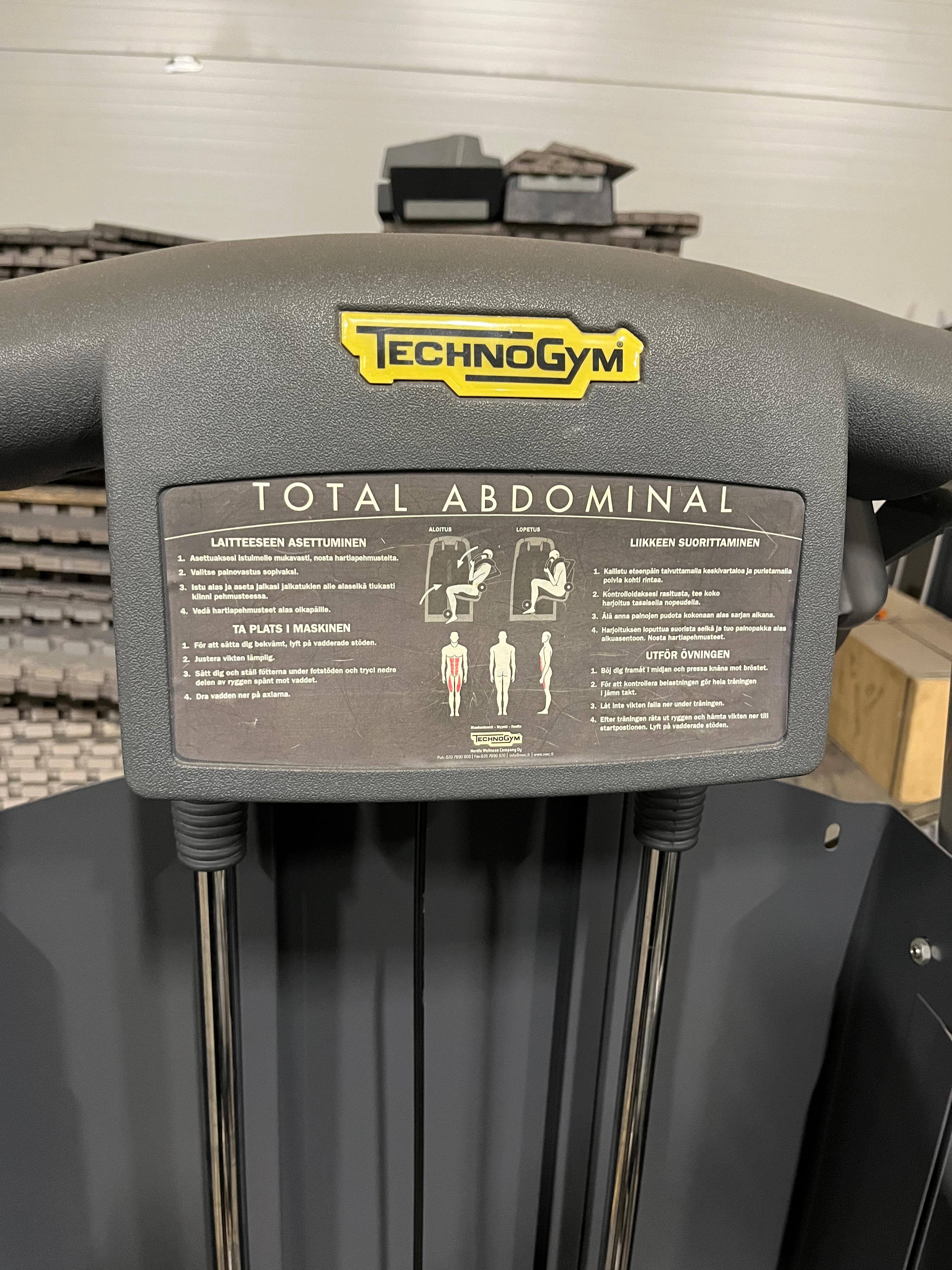 Käytetty Technogym Total Abdominal laite 95 kg painopakalla. Laitteessa kulunut toinen jalkapaikan verhoilupehmuste, sekä käsikahvat.