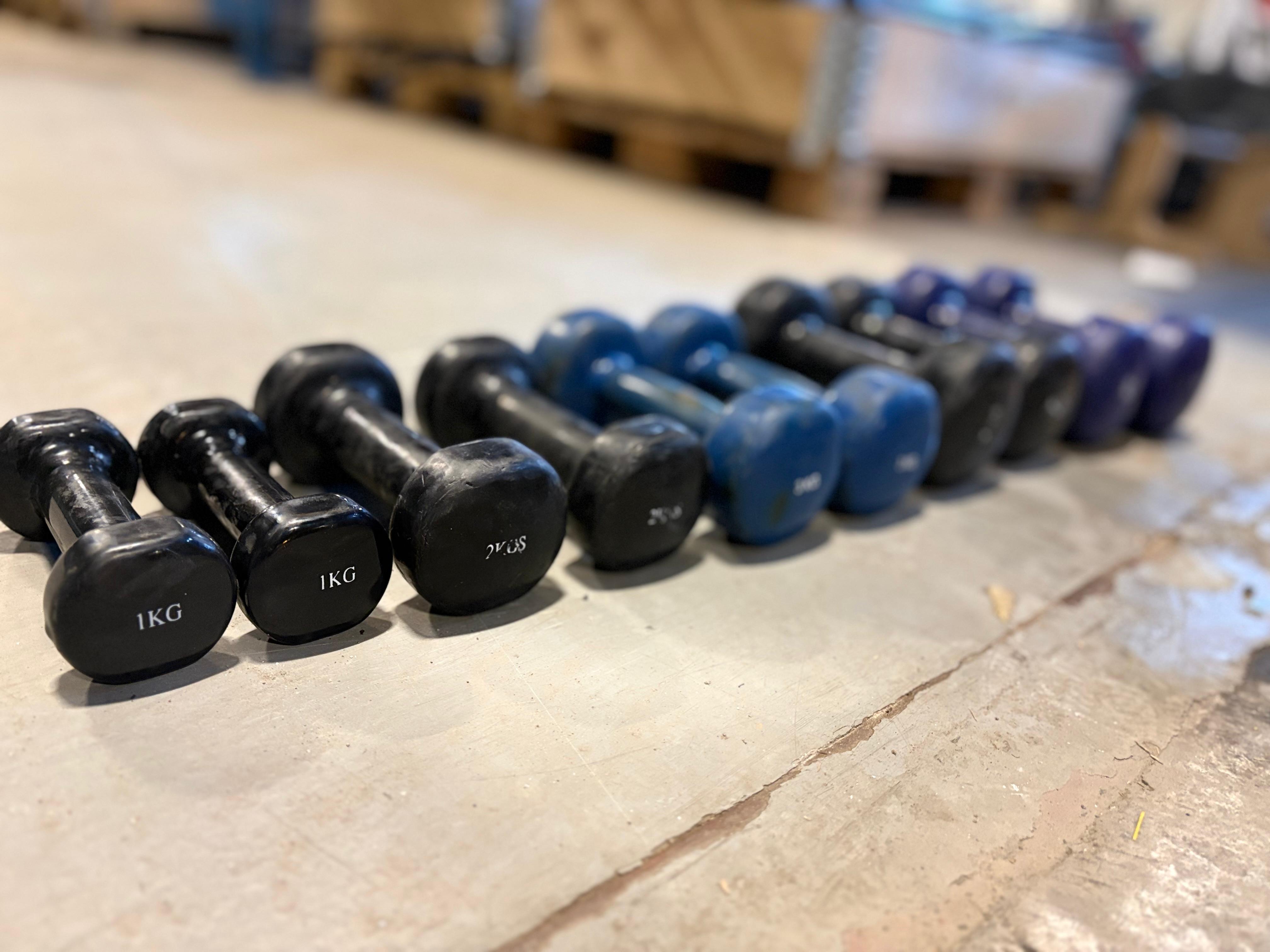 Käytetty vinyylikäsipainosetti. Käsipainoissa hieman käytön jälkiä